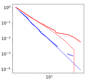 The powerlaw package also makes some great plots. Below is a log log plot generated for our fit of FC3, for the central region of the ESD. The filled lines represent our fits, and the dotted lines are actual power lawPDF (blue) and CCDF (red). The filled lines look like straight lines and overlap the dotted lines–so this fit looks pretty good.