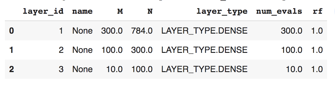 The watcher.analyze() method will generate a pandas dataframe, with layer by layer metrics.