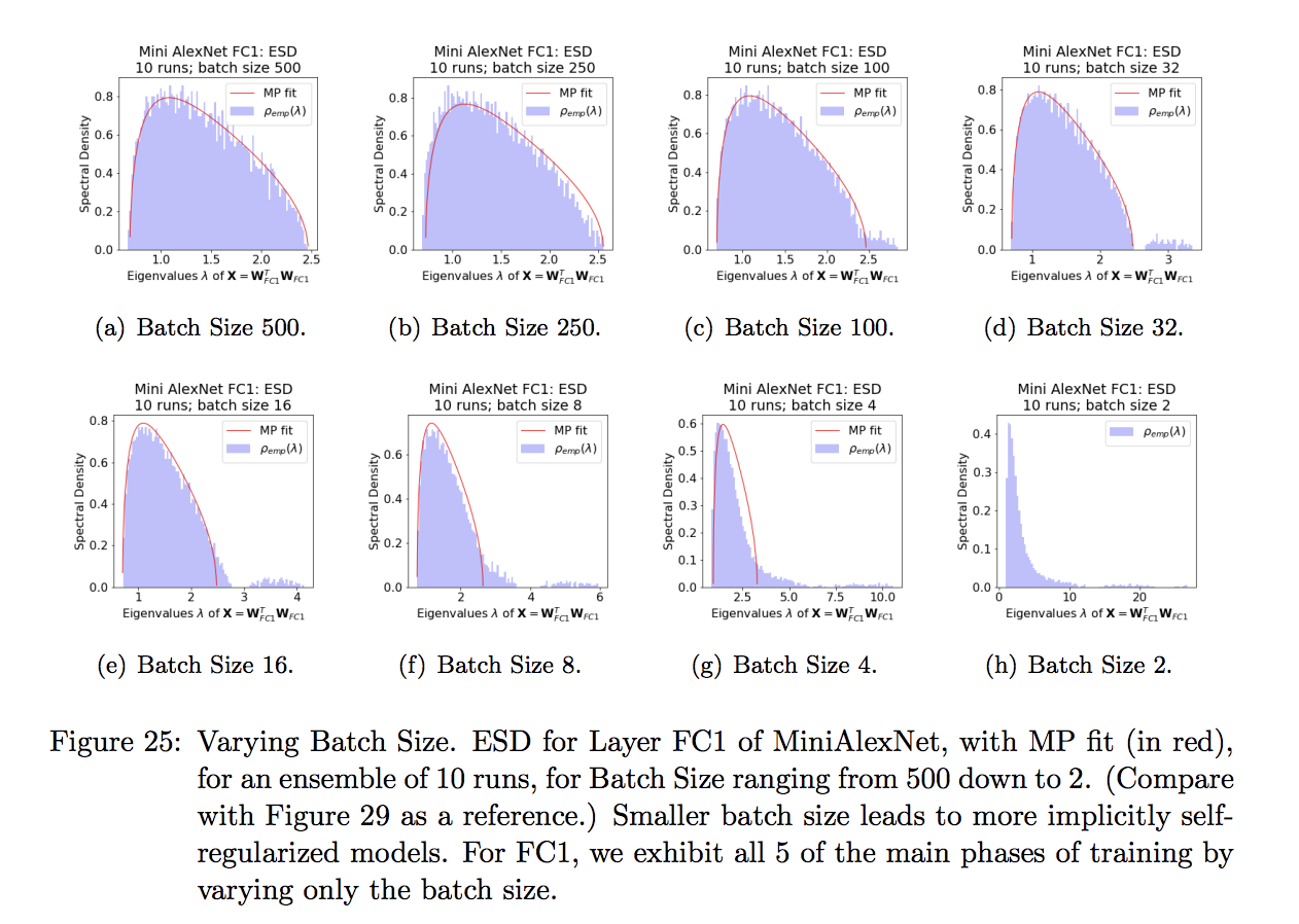 Why do we vary the batch sizes ?… and not a specific regularization hyper-parameter like Weight Decay or Dropout? The batch size acts like a very strong regularizer, which can induce the Heavy-Tails we see in SOTA models even in this very small model and generally poorly performing model. This is shown in Figure 25 of our JMLR paper describing our theory of Heavy-Tailed Self-Regularization (HT-SR), the theory behind weightwatcher.