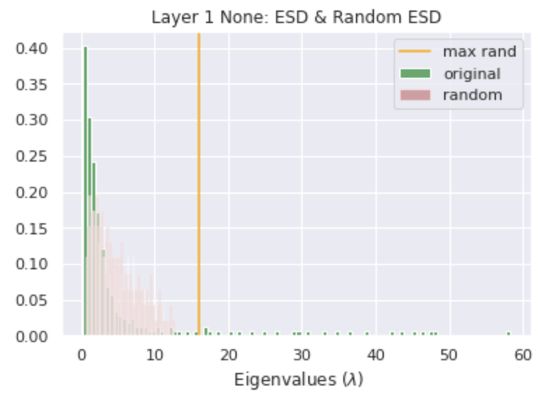 What does alpha mean? Alpha () is a measure of how Heavy-Tailed the layer is. It can be found, crudely, by simply plotting a histogram of the eigenvalue of the layer correlation matrix,
