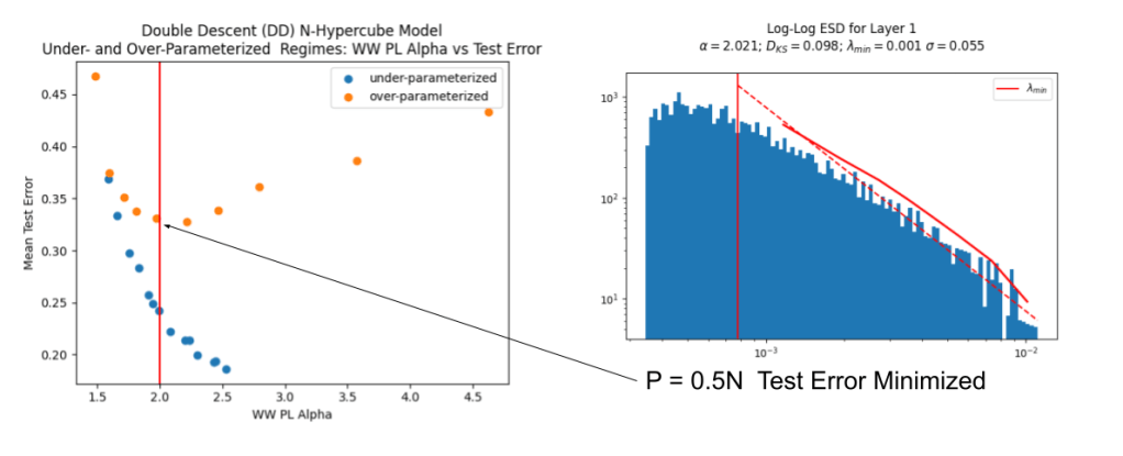 Remarkably, in the case $P=0.5N$, where the test error is minimized, not only is the weightwatcher PL $\alpha_{PL}-2.0$, but the PL tail also satisfies the theoretically predicted volume preserving transformation!