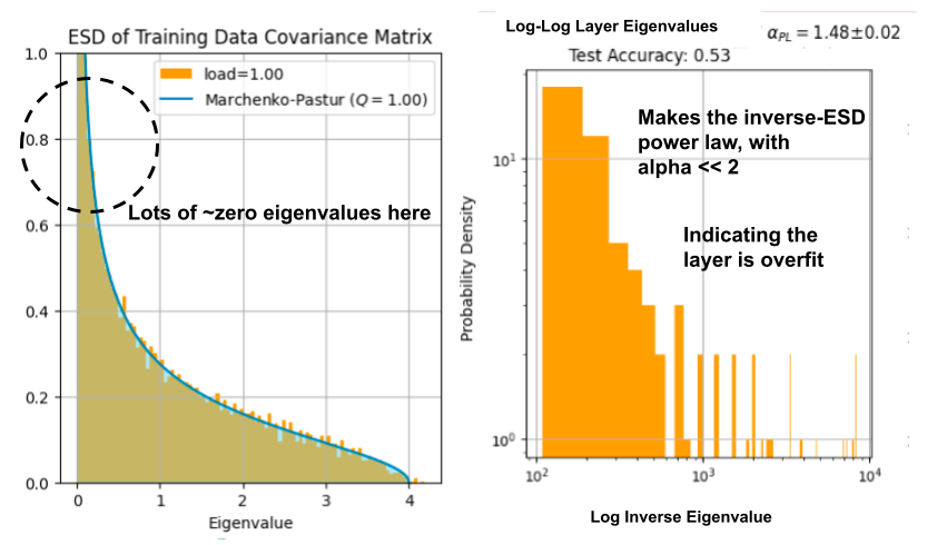 As shown on the RHS (above), when we compute the ESD of the inverse covariance matrix , this ESD can be fit perfectly to a Power Law (PL) distirbution, with alpha exponent $\alpha_{PL}=1.5$ (which is the lower limit of the Clauset esimator weightwatcher users). This means the inverse covariance matrix is highly atypical, and is dominated by the largest (inverse) eigencomponents. Because of this, this matrix is not a typical sample or view on the training data, and it can not describe anything but the training data. In other words, the model is severely overfit.