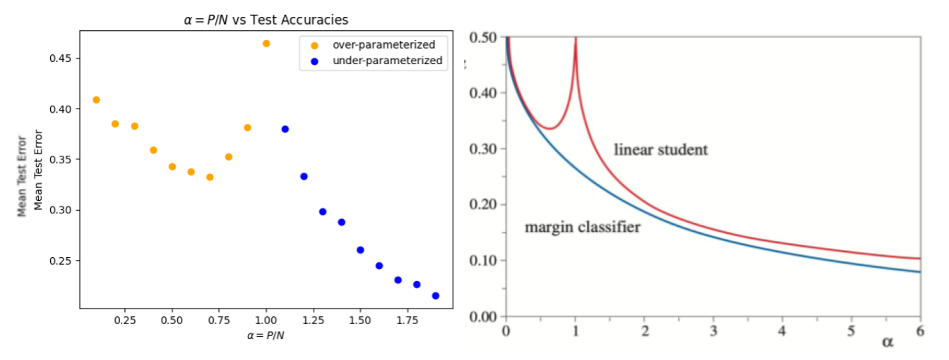- over-parameterized: N > P: We have more features, and therefore more adjustable weights, than training data. Of course, in this simple model, the test accuracy is no better than say 65%. But it does work. And this is the regime most interesting to LLMs and other Deep Neural Networks.