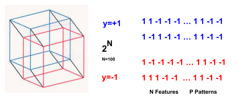 In this case, the data instances are drawn from the vertices of an N-dimensional hypercube and the labels are +1 or -1, depending on the sum of the ‘1s’ in the instance data vector.