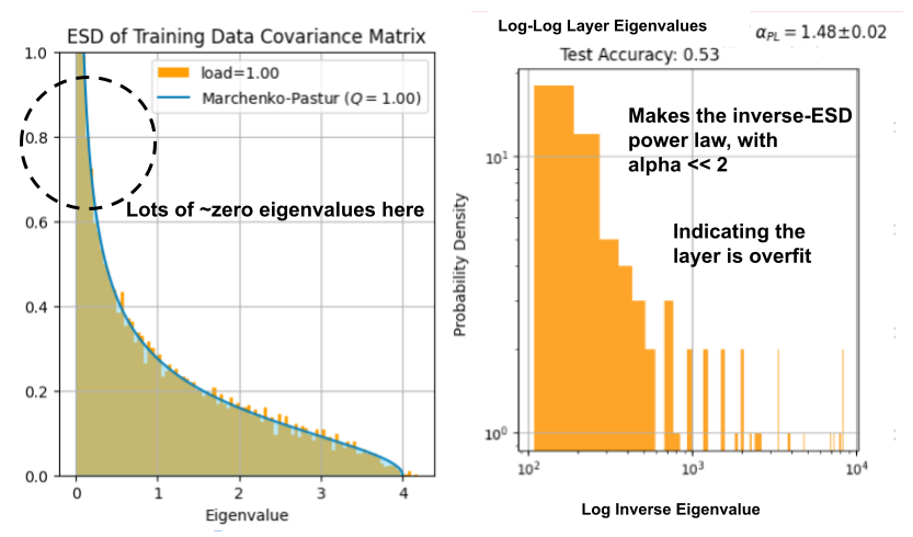 As shown on the RHS (above), when we compute the ESD of the inverse covariance matrix , this ESD can be fit perfectly to a Power Law (PL) distirbution, with alpha exponent $\alpha_{PL}=1.5$ (which is the lower limit of the Clauset esimator weightwatcher users). This means the inverse covariance matrix is highly atypical, and is dominated by the largest (inverse) eigencomponents. Because of this, this matrix is not a typical sample or view on the training data, and it can not describe anything but the training data. In other words, the model is severely overfit.